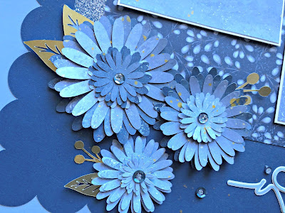 Tonight I want to share a layout that I created with our Serenity paper (that I just can't get enough of), the Blue Belle glitter paper and our exclusive Cricut cuts. I love the elegance of the Gerber Daisy - I think it is my favorite image on the Flower Market Cricut Collection as I keep going back to it time and time. In my mind it is elegant, sassy and fun all at the same time.