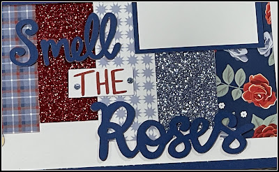 Stop & Smell the Roses Layout: (1385) White Daisy cs, (X5957) Sapphire cs, (X6049) Scarlet cs, (X6047) Periwinkle cs, (Z4625) Periwinkle Glitter Paper, (Z3839) Scarlet Glitter Paper, (Z3840) Sapphire Glitter Paper, (retired) Hello Darlin' Paper Pack, (retired) Blue Belle Glitter Gems.